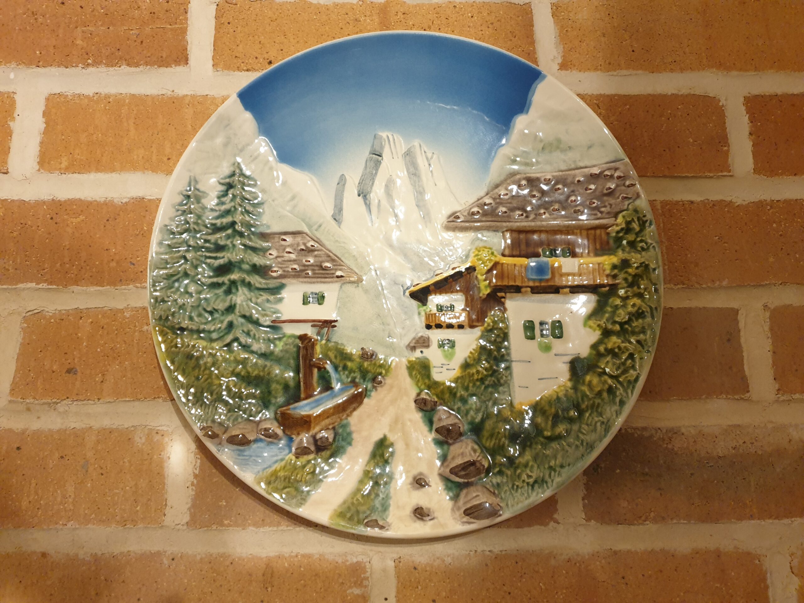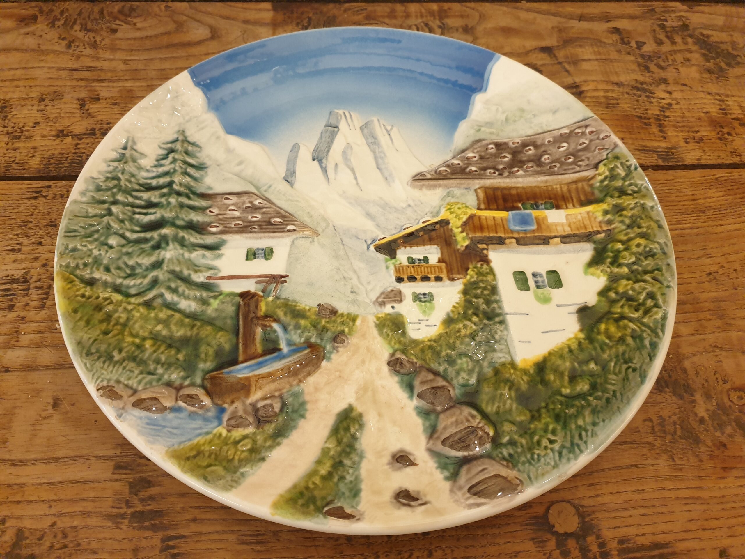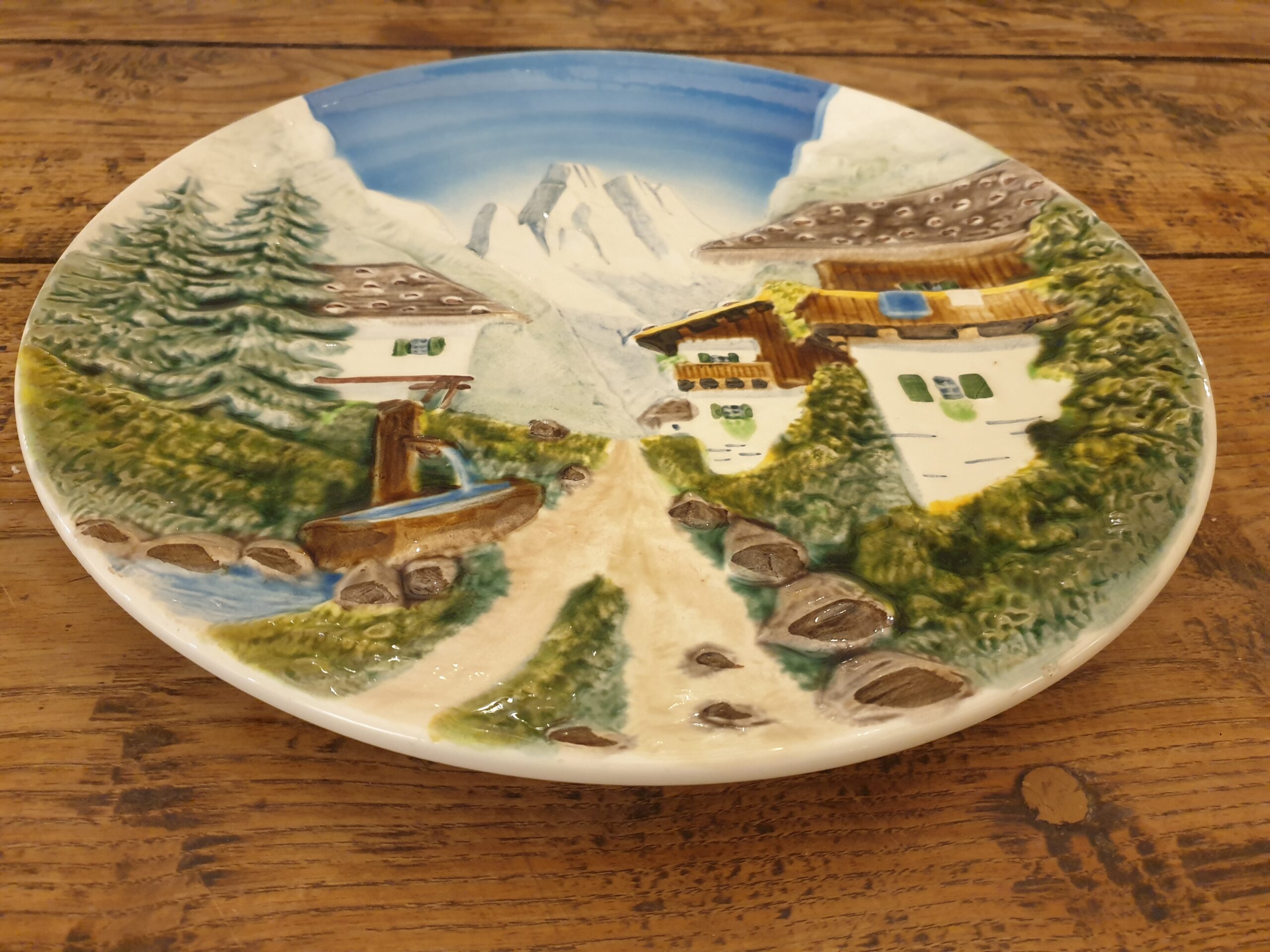 La majolique se distingue par son émail éclatant et ses couleurs vives. Ce procédé de décoration apporte profondeur et relief au paysage de montagne représenté sur l’assiette.