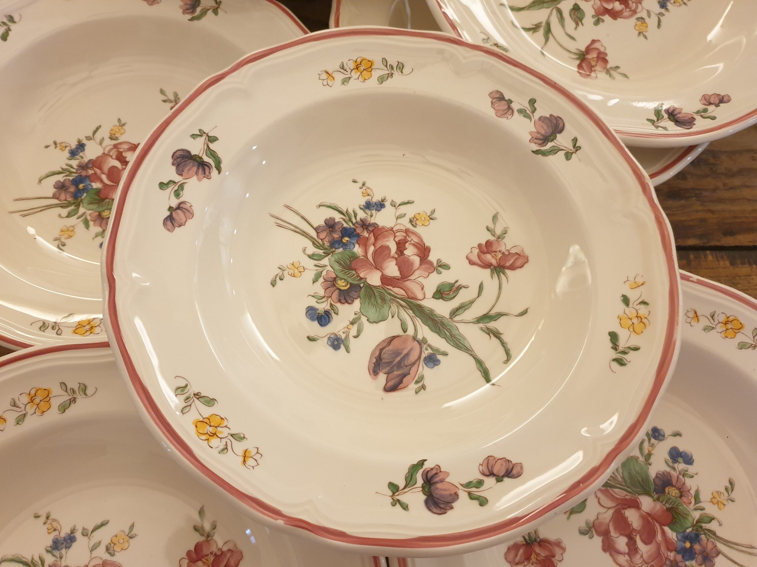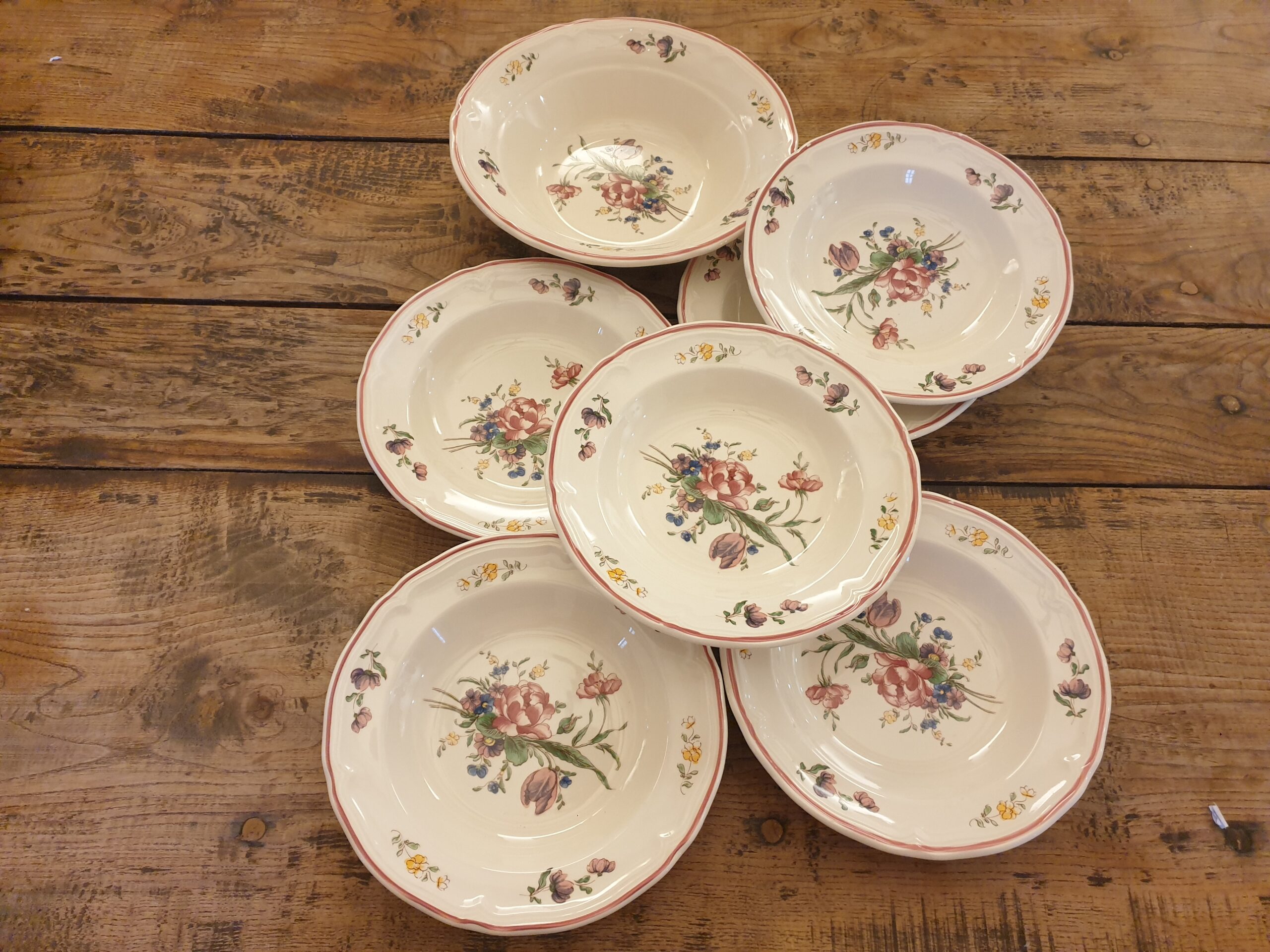 Dimensions : assiette : diamètre : 22 cm, saladier : diamètre : 25 cm, hauteur : 7 cm