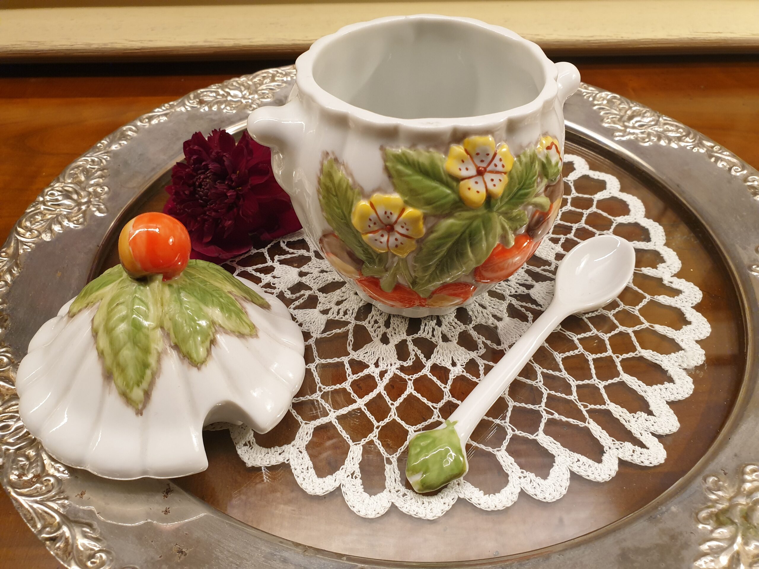 Les motifs de fruits et de fleurs, peints à la main, apportent une note vibrante et joyeuse à cet objet. Ce décor fait écho à la richesse de la nature, apportant une dimension organique et fraîche au confiturier.