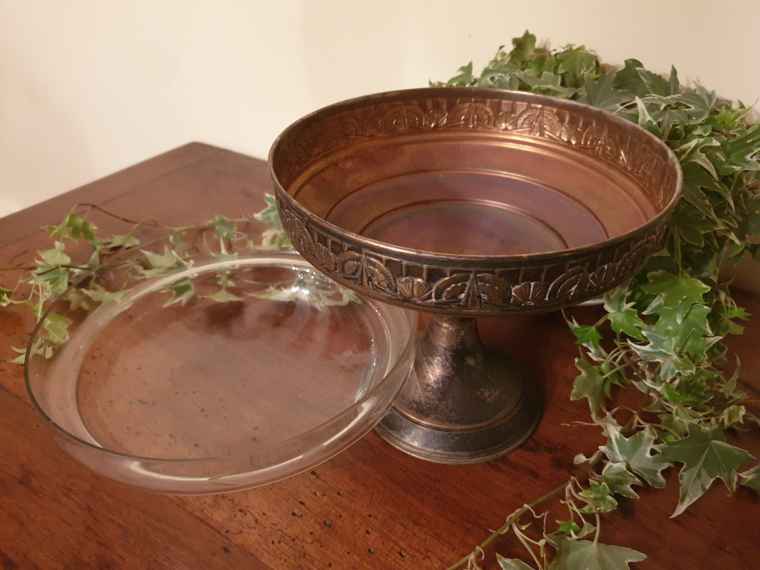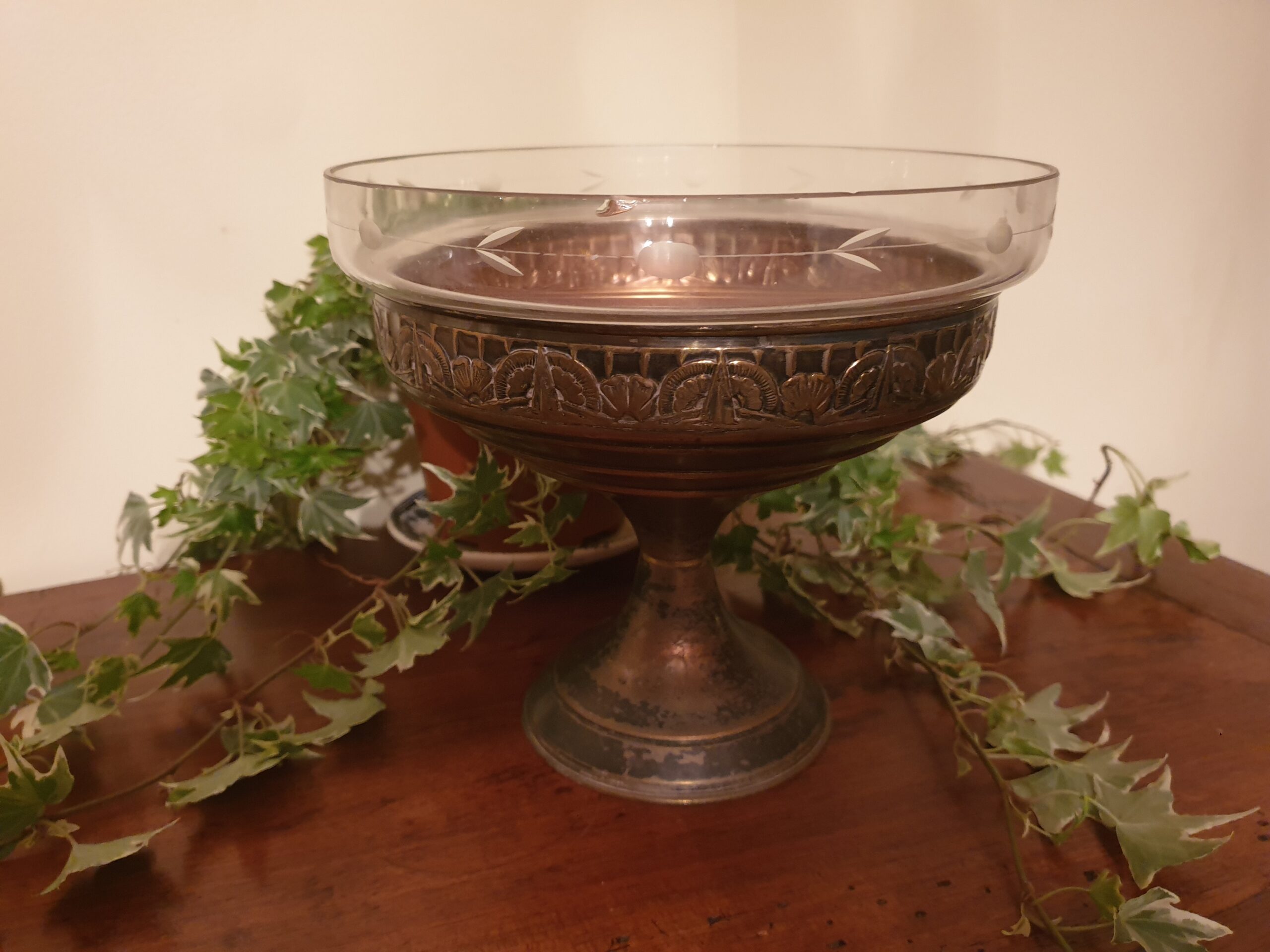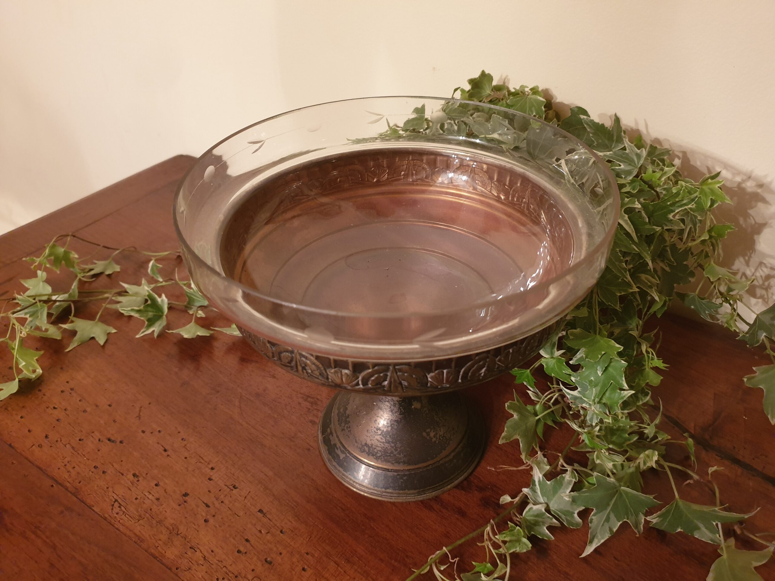 Contenu : 1 coupe en laiton argenté, 1 vasque en verre gravé