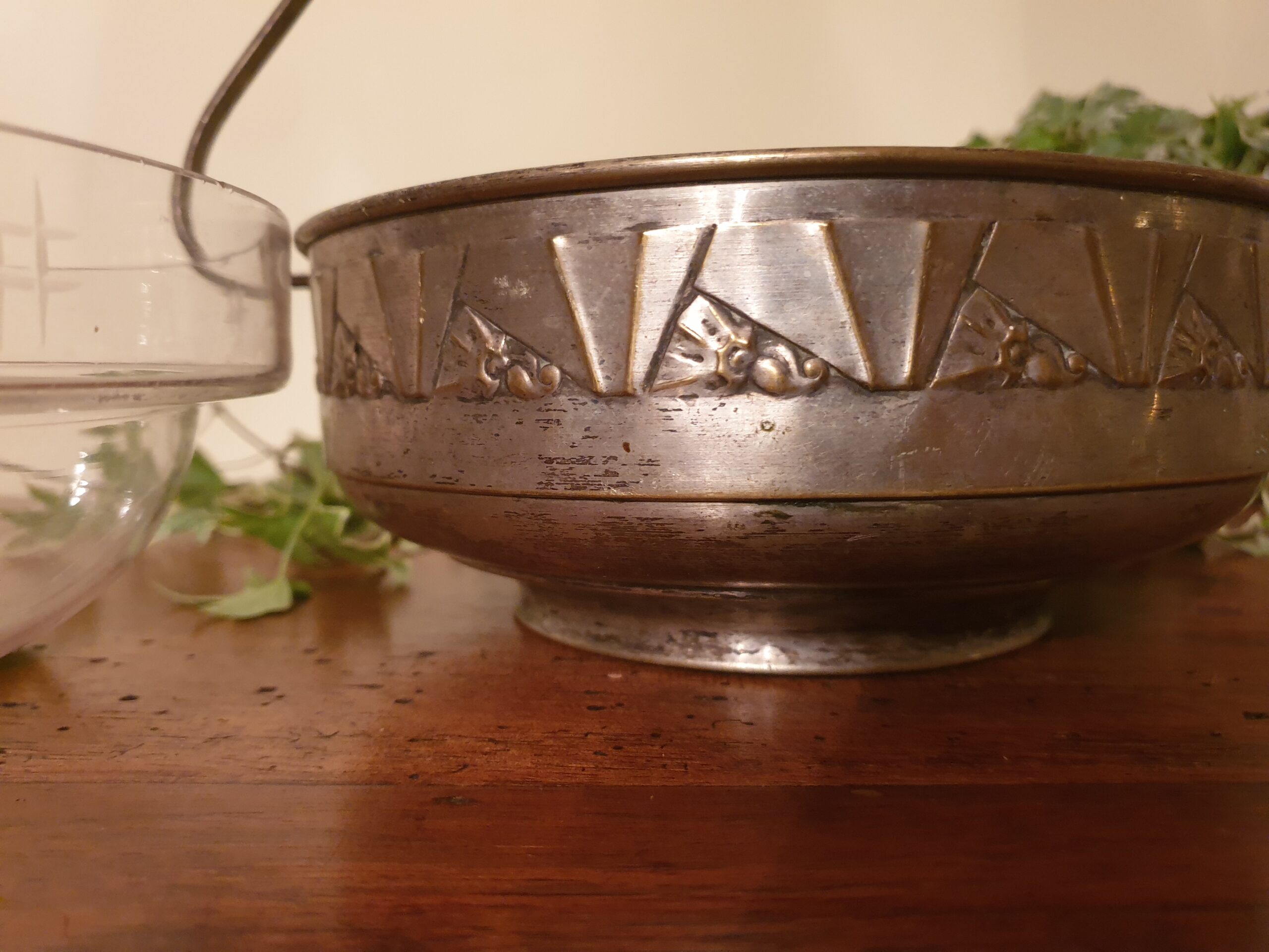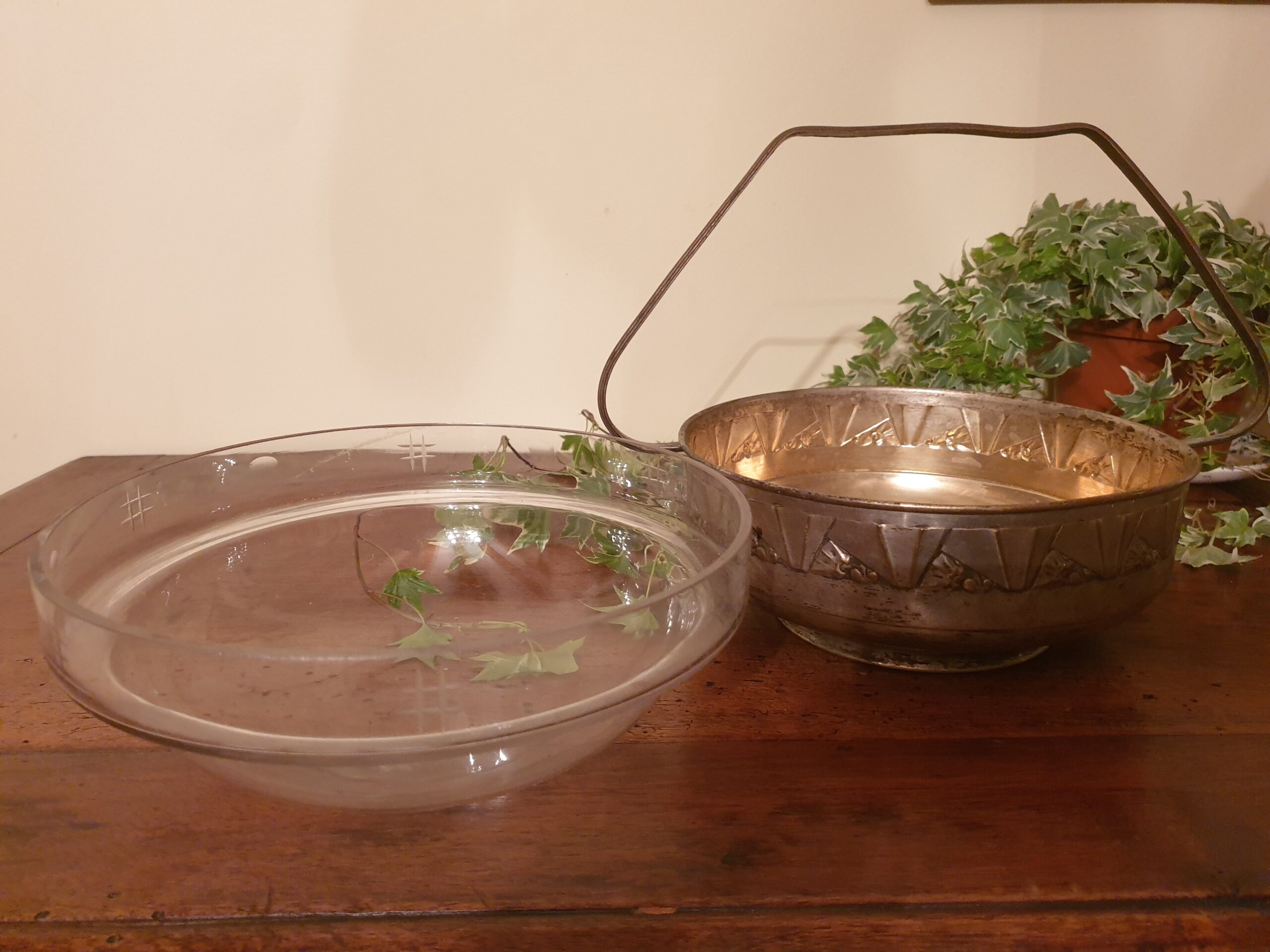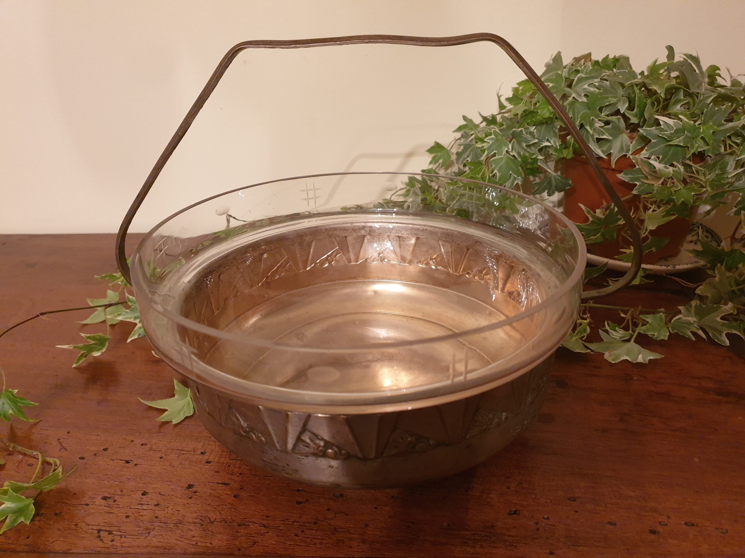 Contenu : 1 panier en laiton argenté, 1 vasque en verre gravé