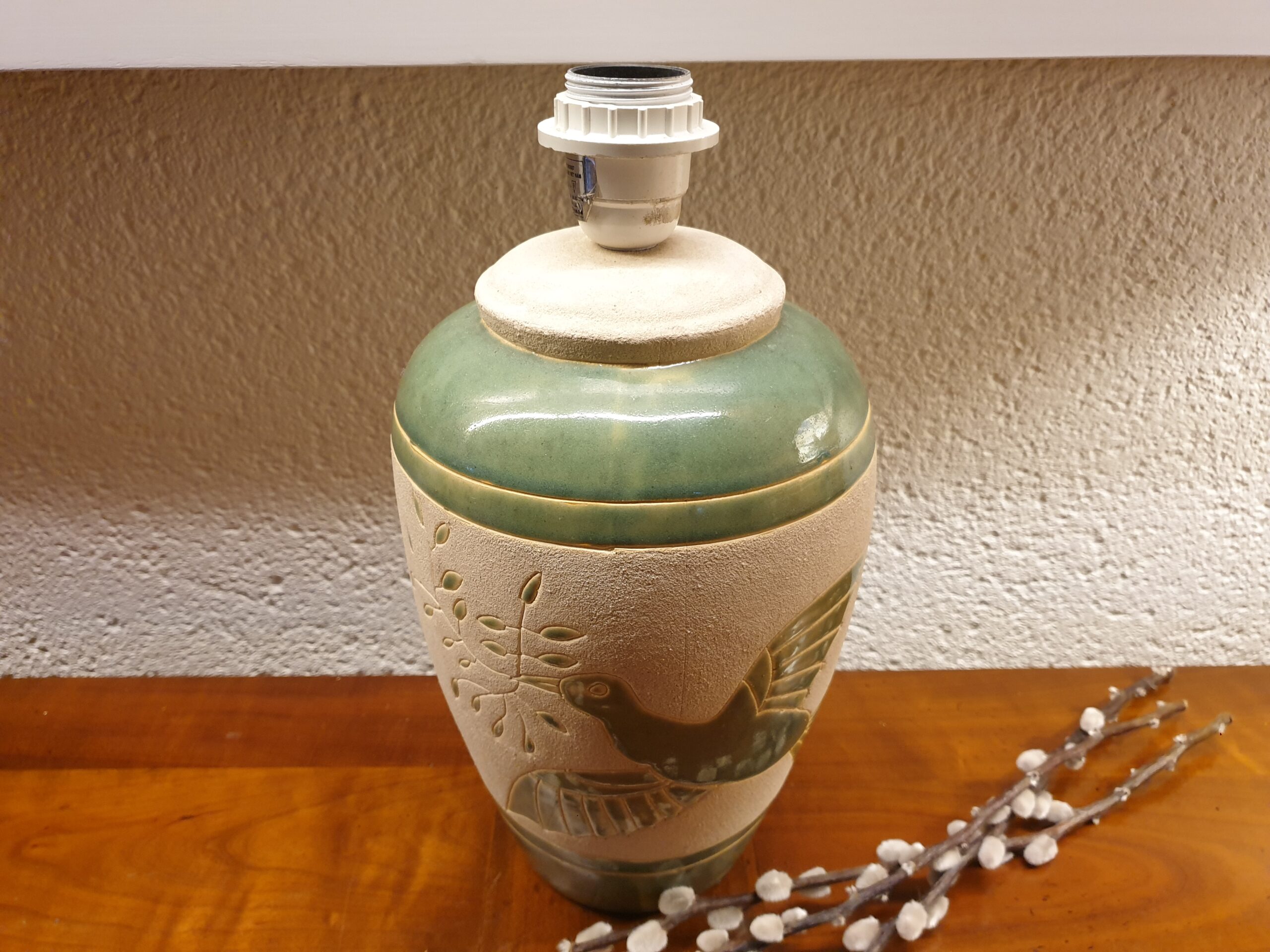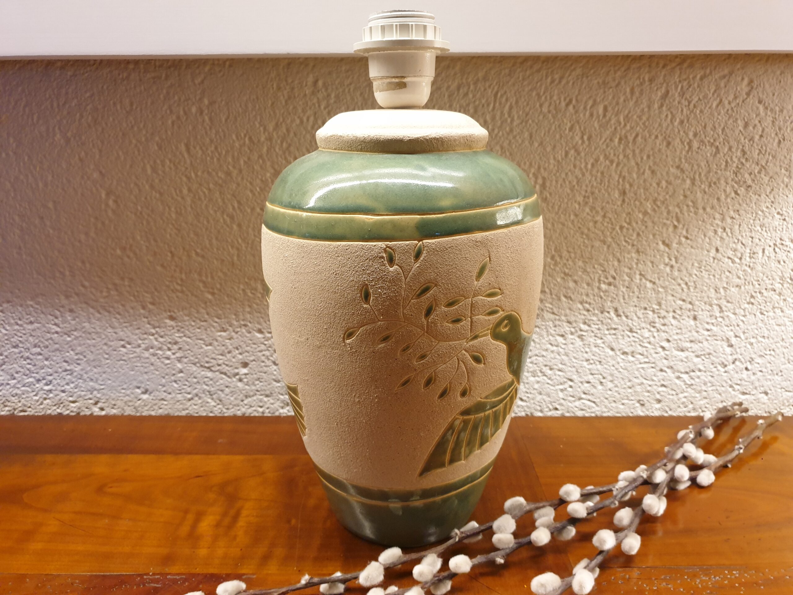 Ce pied de lampe en céramique ornée de décors d’oiseaux et de feuillages apporte une touche de fraîcheur et de nature dans votre espace. Ses teintes vertes et beiges subliment l’élégance de ses motifs, créant une ambiance chaleureuse et apaisante dans votre intérieur.