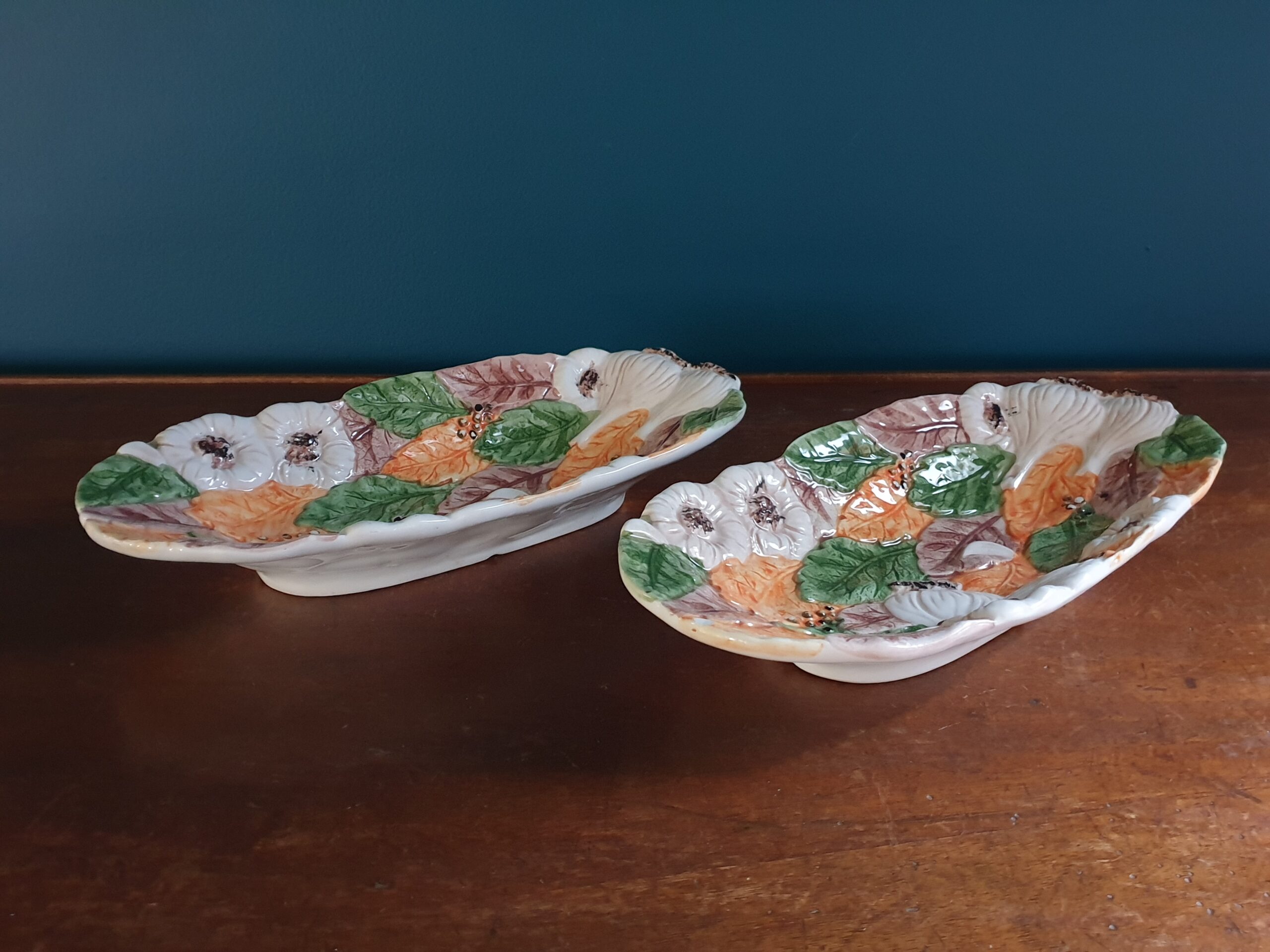 Ces plats rehaussés d’aulx et de feuillages en relief ne manqueront pas d’attirer les regards et d’ajouter une touche de fraîcheur à vos repas. Ils sont parfaits pour égayer vos occasions spéciales ou pour enrichir votre collection de vaisselle vintage.