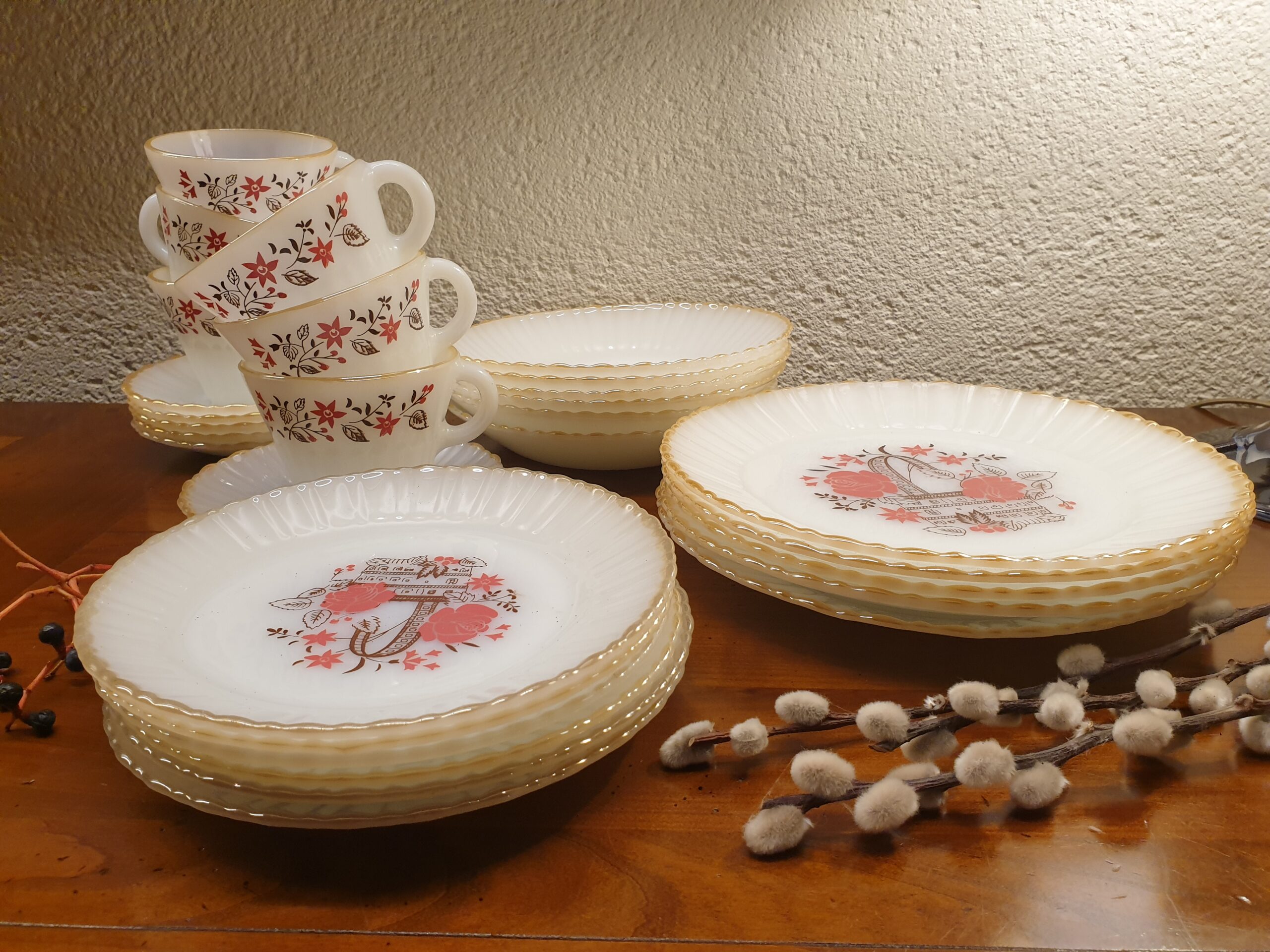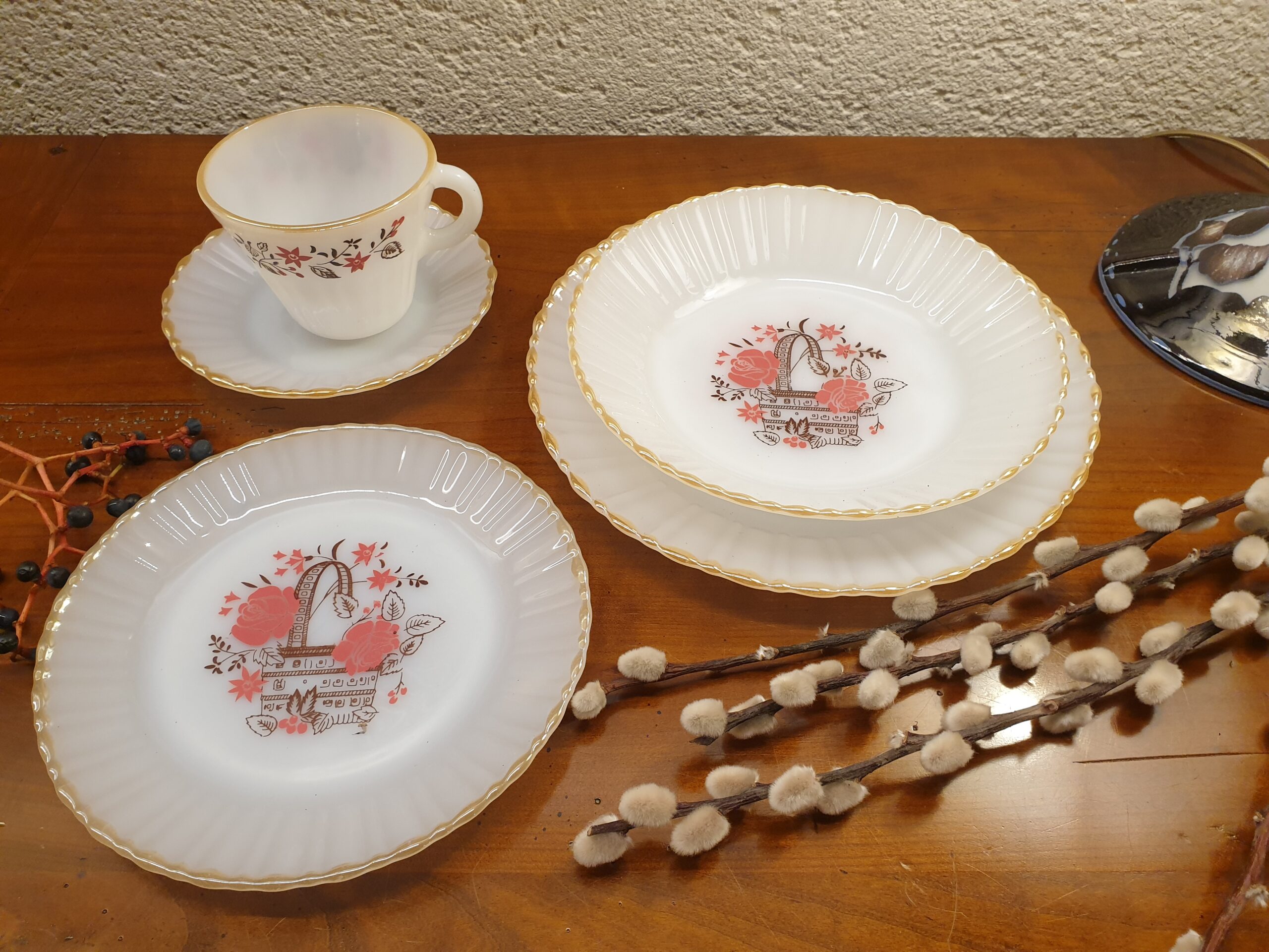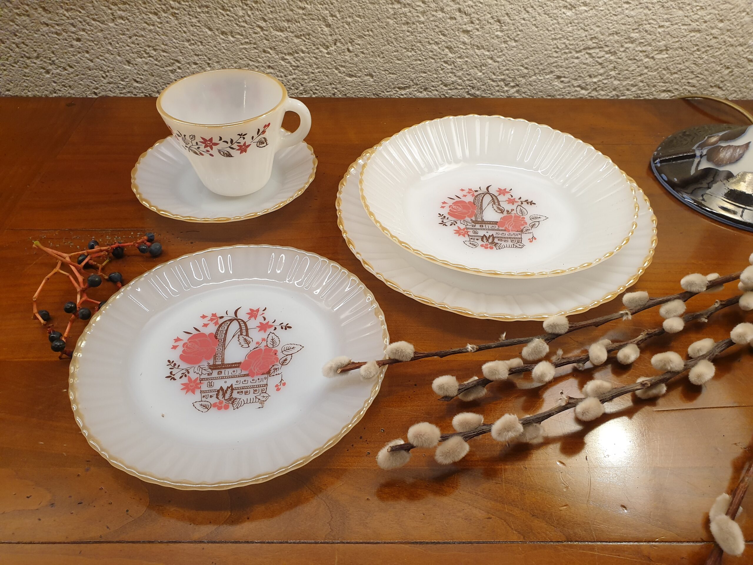 Contenu : 6 assiettes creuses, 6 assiettes à dessert, 5 assiettes plates, 6 tasses, 6 soucoupes