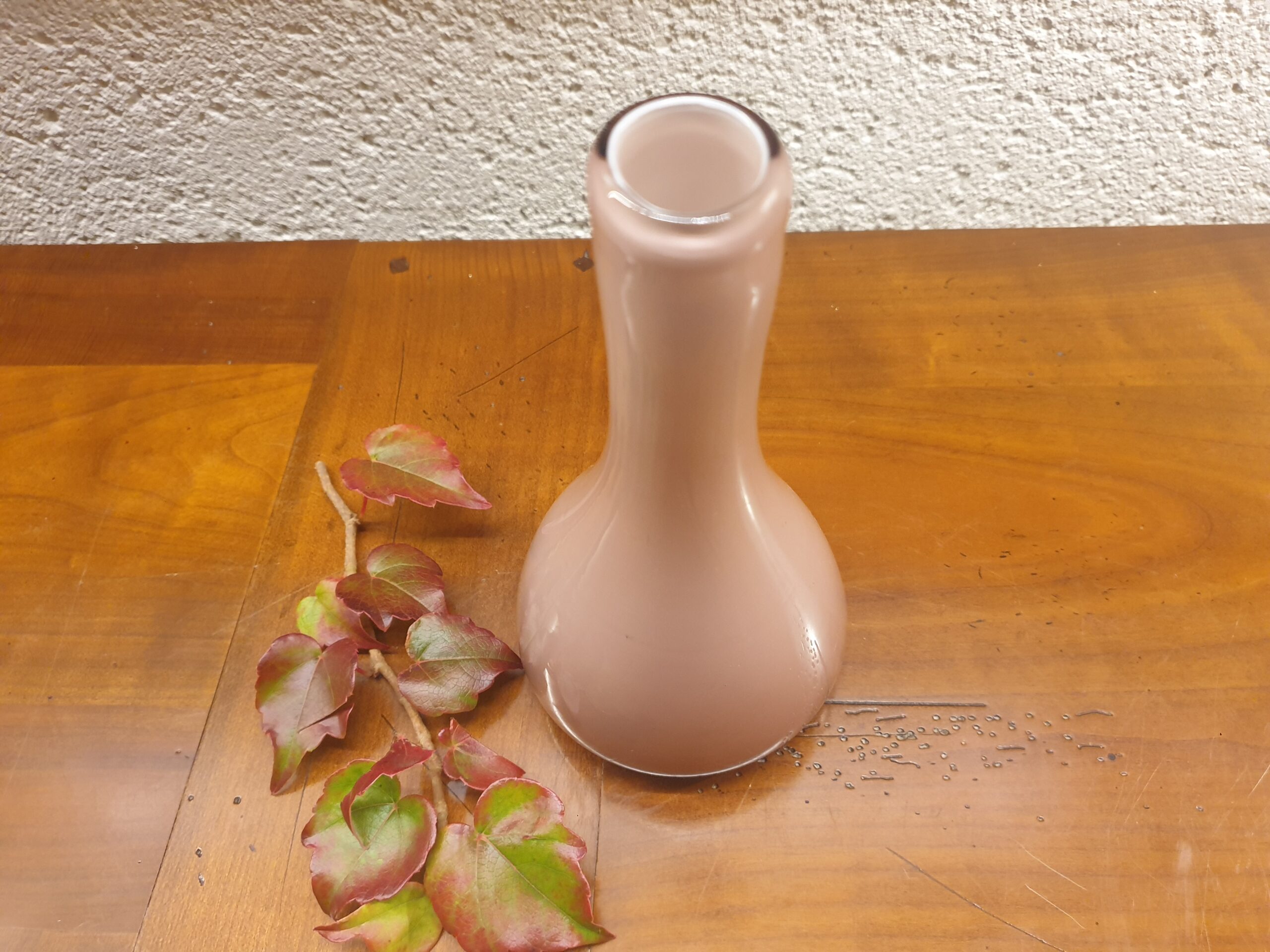 La teinte rose pâle de ce soliflore, avec ses nuances douces et lumineuses, créera une atmosphère chaleureuse et accueillante. Le verre opalescent capte la lumière de manière discrète, mettant en valeur les fleurs qu’il contient.