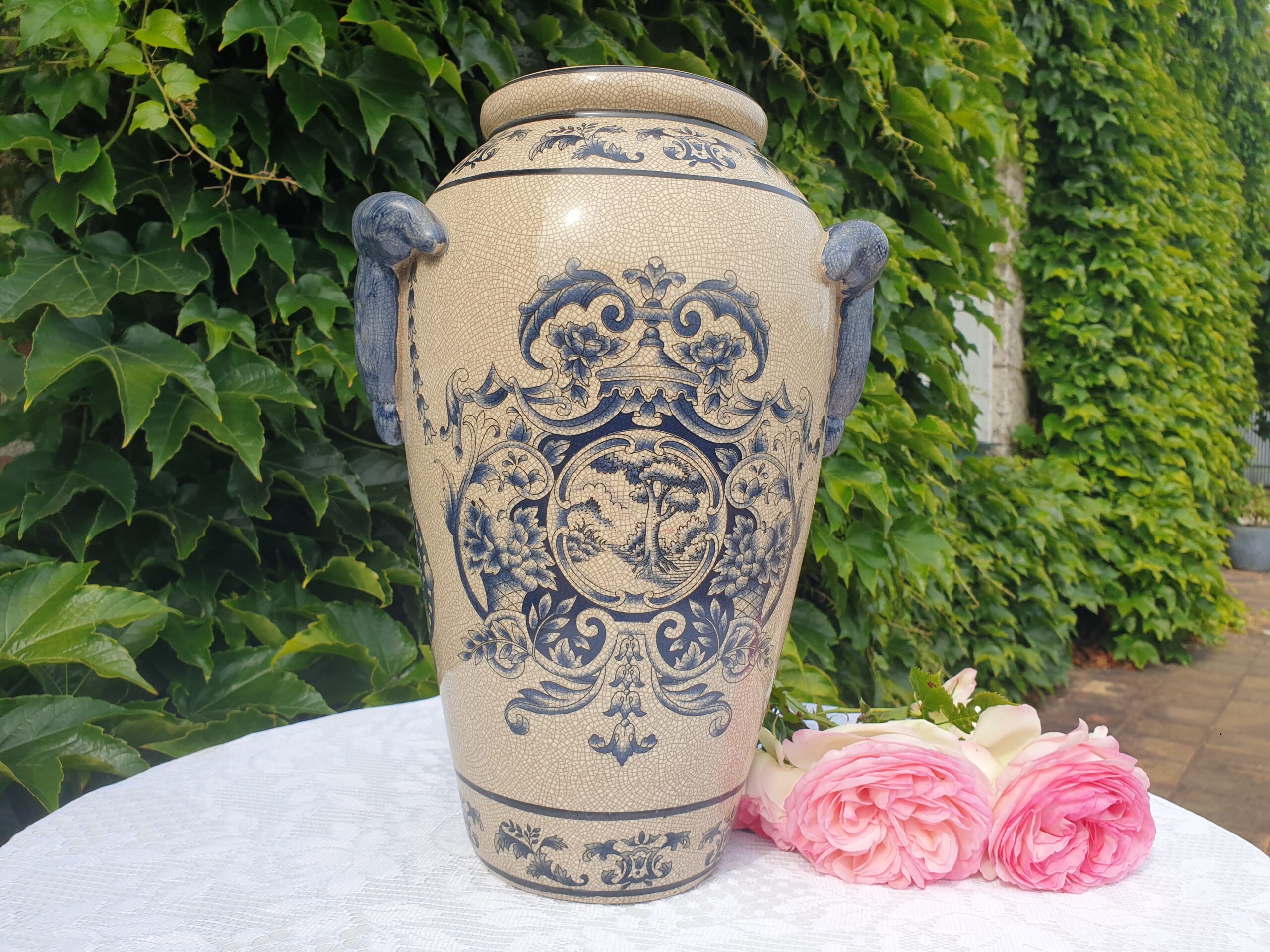 Ce vase amphore chinois aux motifs craquelés séduit par son allure classique et son décor végétal raffiné. Orné de feuilles d’acanthe et de feuillage bleu, il évoque le savoir-faire ancestral de la céramique chinoise. À la fois décoratif et chargé d’histoire, il trouvera sa place dans tous les intérieurs en quête d’authenticité.
