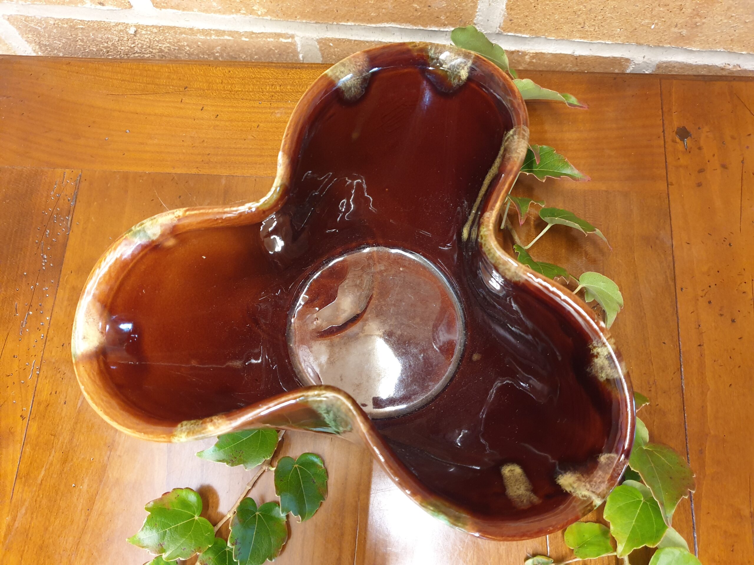 Ce vase arbore un émaillage spectaculaire aux nuances de marron et de vert, une signature des céramiques de Vallauris. Le jeu des coulures et des variations de couleurs donne à chaque pièce un caractère unique, apportant profondeur et relief à sa surface.