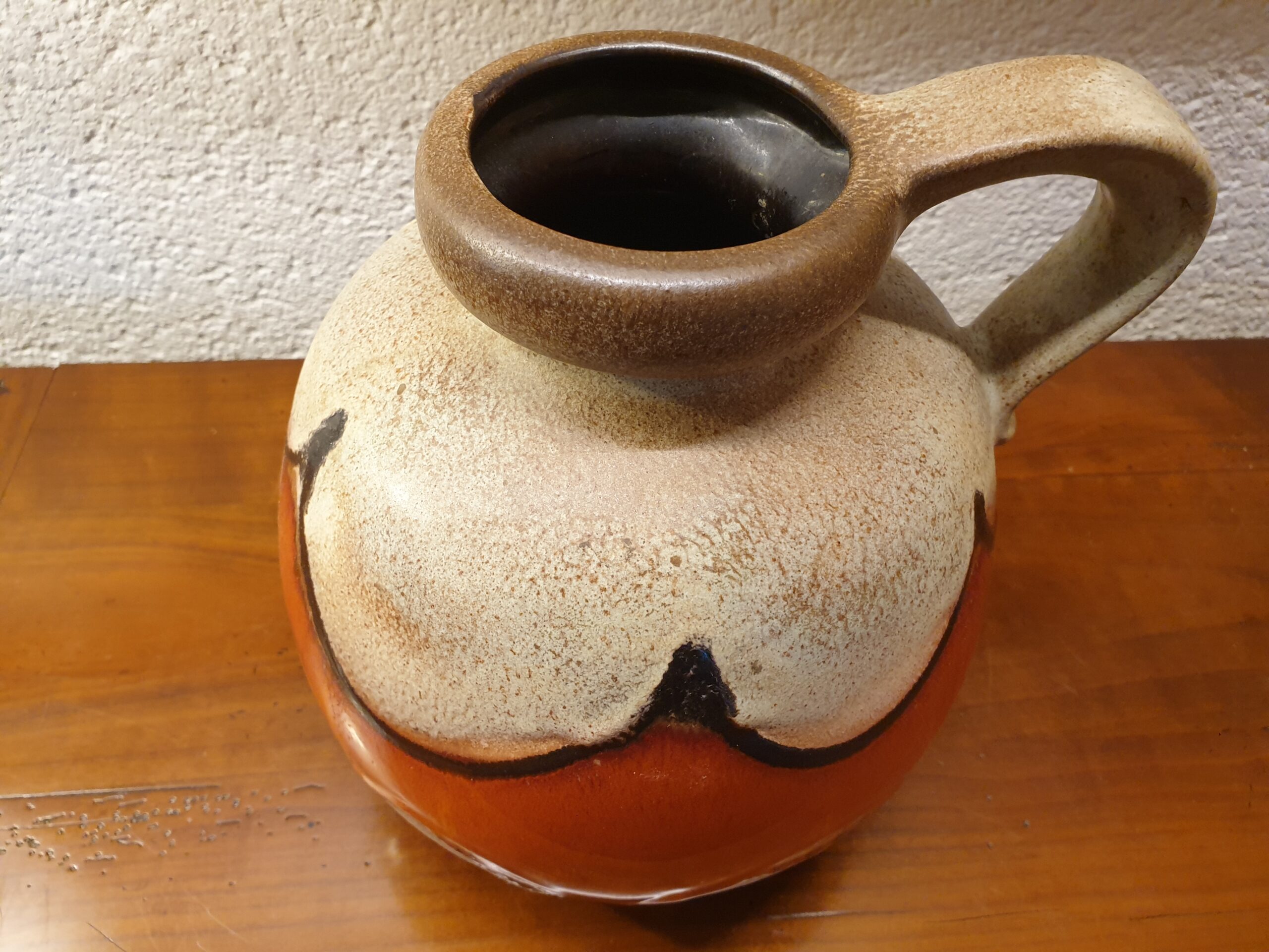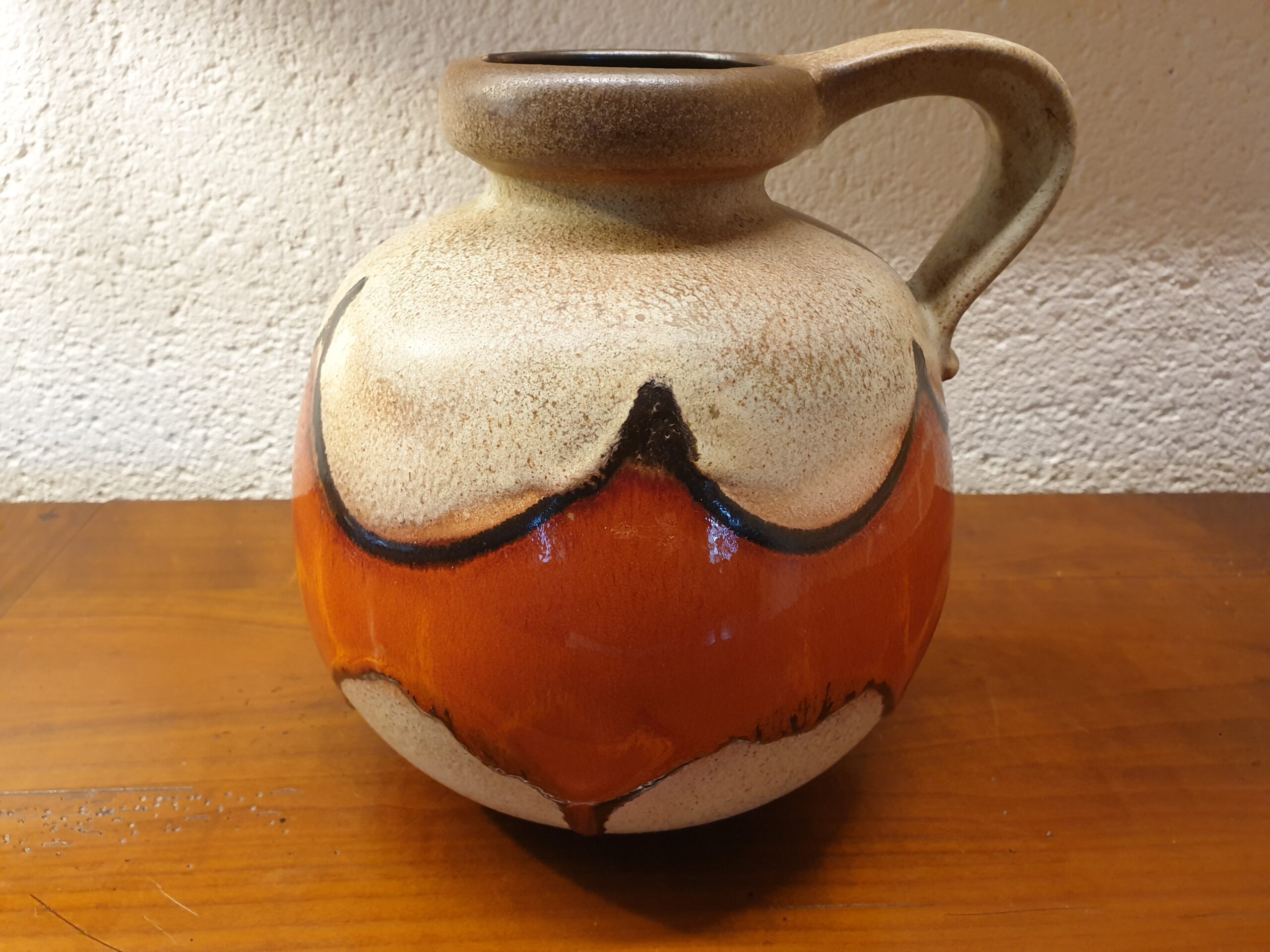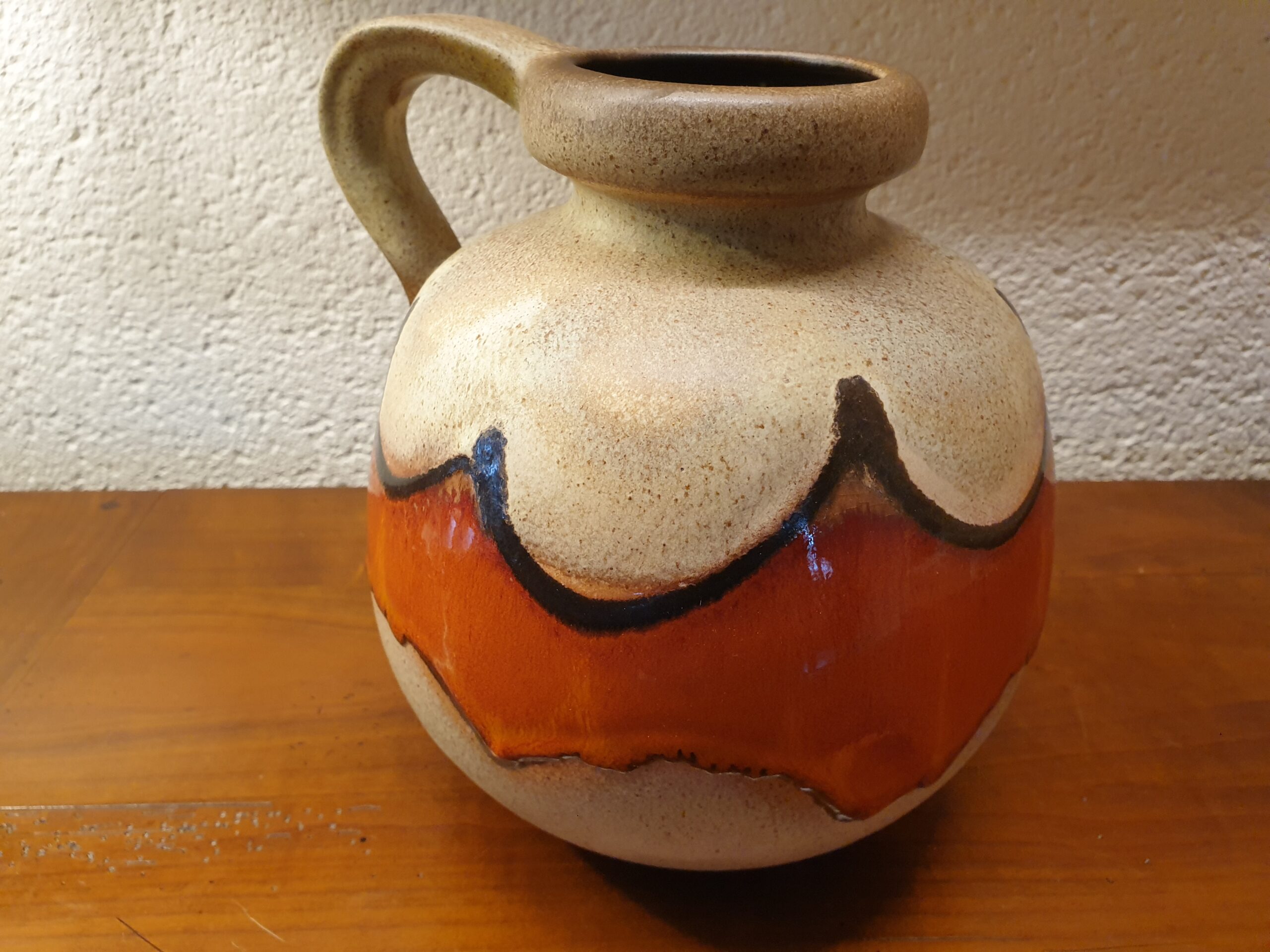 Le motif orange, de lignes abstraites, donne à ce vase un caractère distinctif. Ce design coloré et énergique est typique des créations de West Germany, qui ont marqué l’histoire du design vintage.