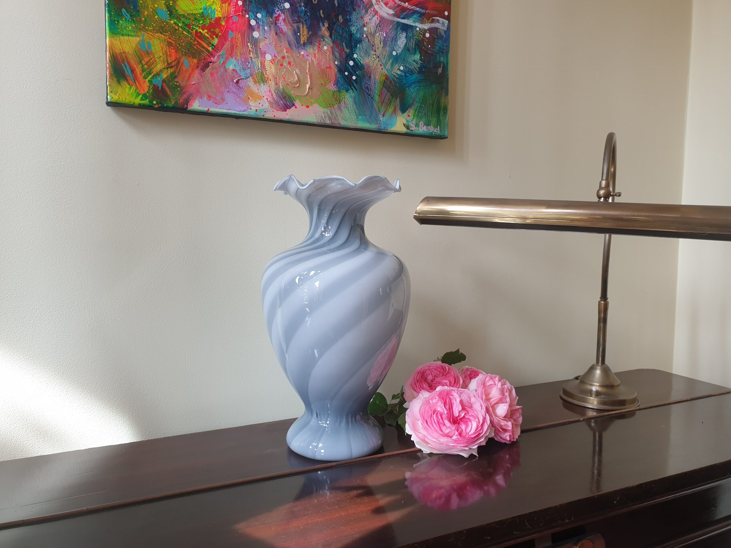 Entre la finesse du verre opalin et le mouvement du décor en spirale, ce vase incarne une élégance naturelle et intemporelle. Son col en corolle lui confère une originalité pleine de douceur.