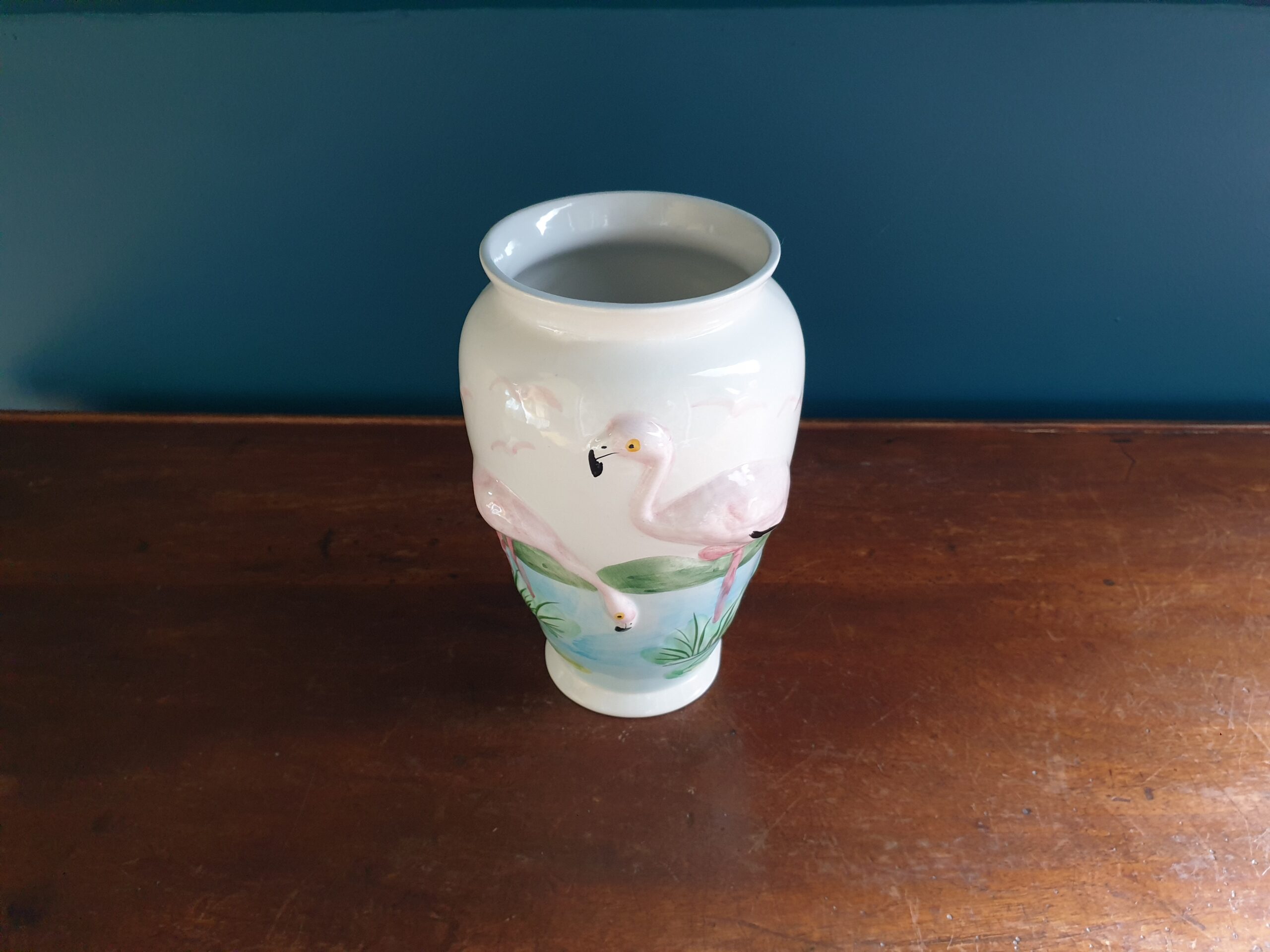 Réalisé en barbotine, ce vase met en valeur le travail minutieux des artisans. La technique de la barbotine permet de créer des motifs en relief, donnant vie aux flamants roses avec une précision étonnante.