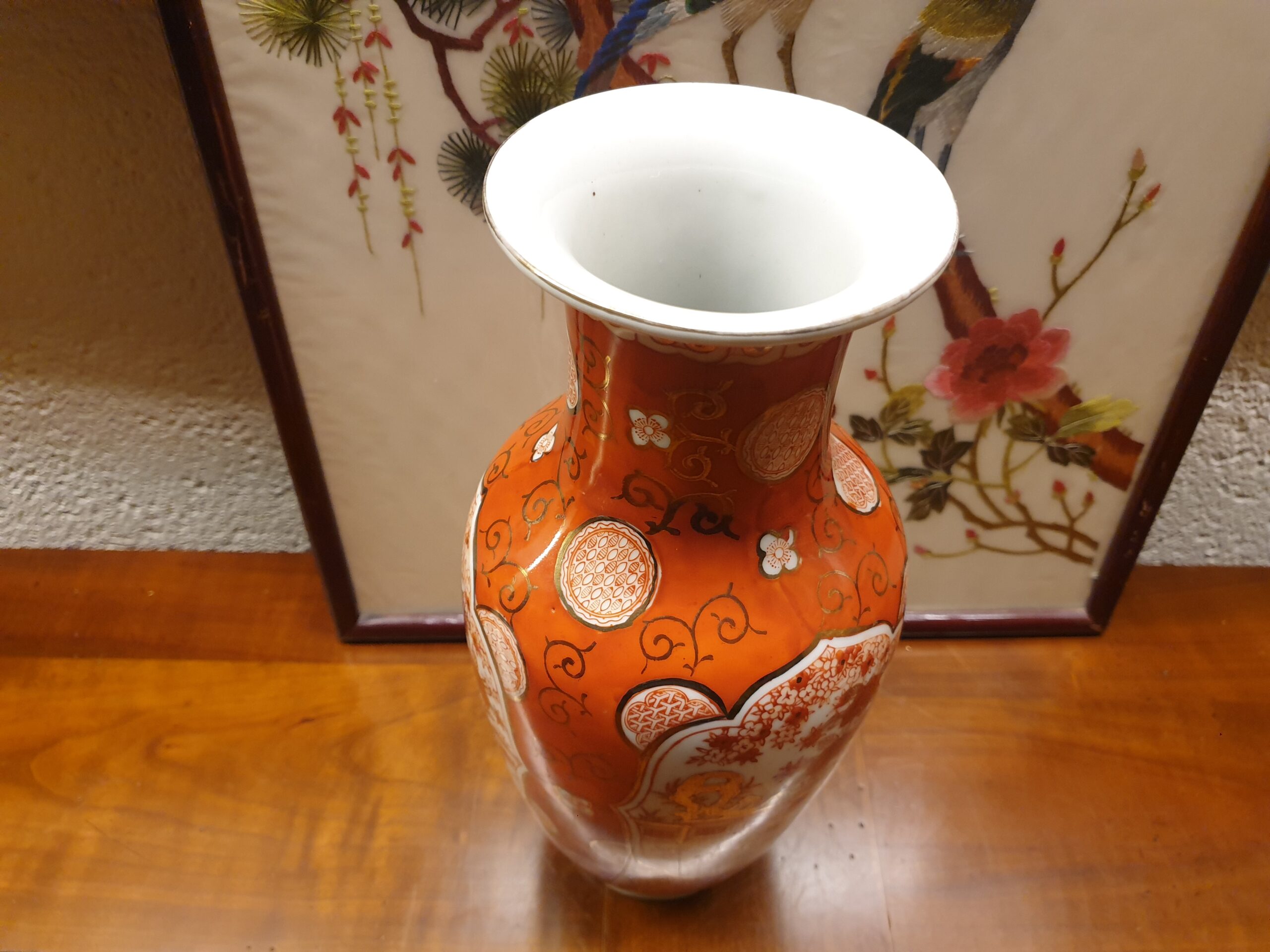 Chaque motif est minutieusement appliqué à la main par des artisans spécialisés. Le orange profond et les touches dorées créent un contraste harmonieux. Ce décor raffiné met en avant des inspirations florales et traditionnelles chinoises, soulignant le caractère précieux de la pièce.